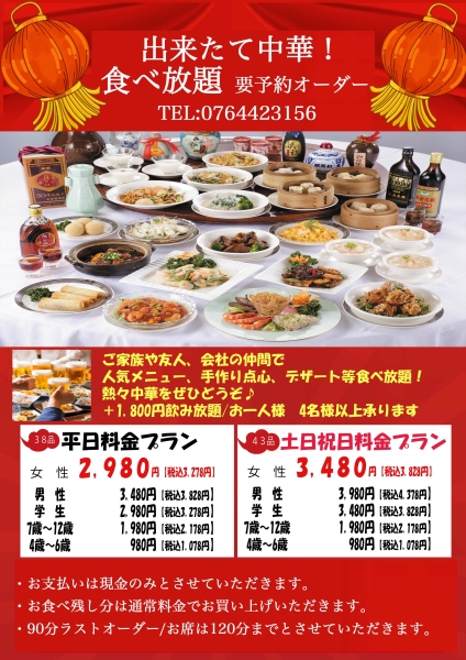 中華出来たて食べ放題コース3278円〜 予約を承ります。